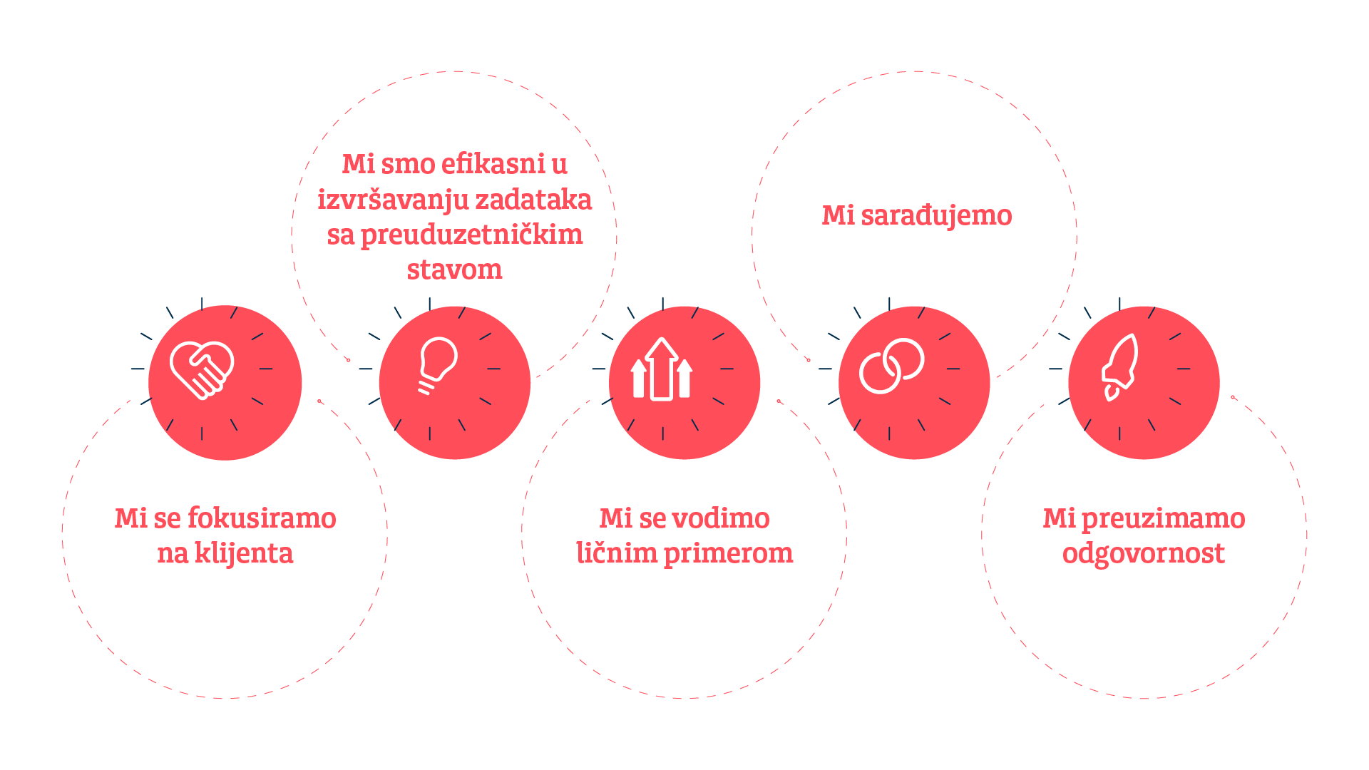 Volimo reći da smo banka sa srcem startupa jer spajamo najbolje od oba svijeta, pouzdanost banke i inovativnost startupa. Gradimo kulturu netipičnih bankara koji svoje znanje dijele sa zajednicom u kojoj žive i rade. Mi smo stručnjaci koji razmišljaju van ustaljenih okvira bankarstva. Umjesto da čekamo da se stvari dogode, aktivno ih oblikujemo. Uspješni smo kada se svi osjećamo kao dio tima, kad dijelimo svoju strast i doprinosimo stvaranju nečeg novog i vrijednog. Vjerujemo u kulturu podsticanja inovativnih rješenja, uvažavanja povratnih informacija i njegovanja ljudskih odnosa.